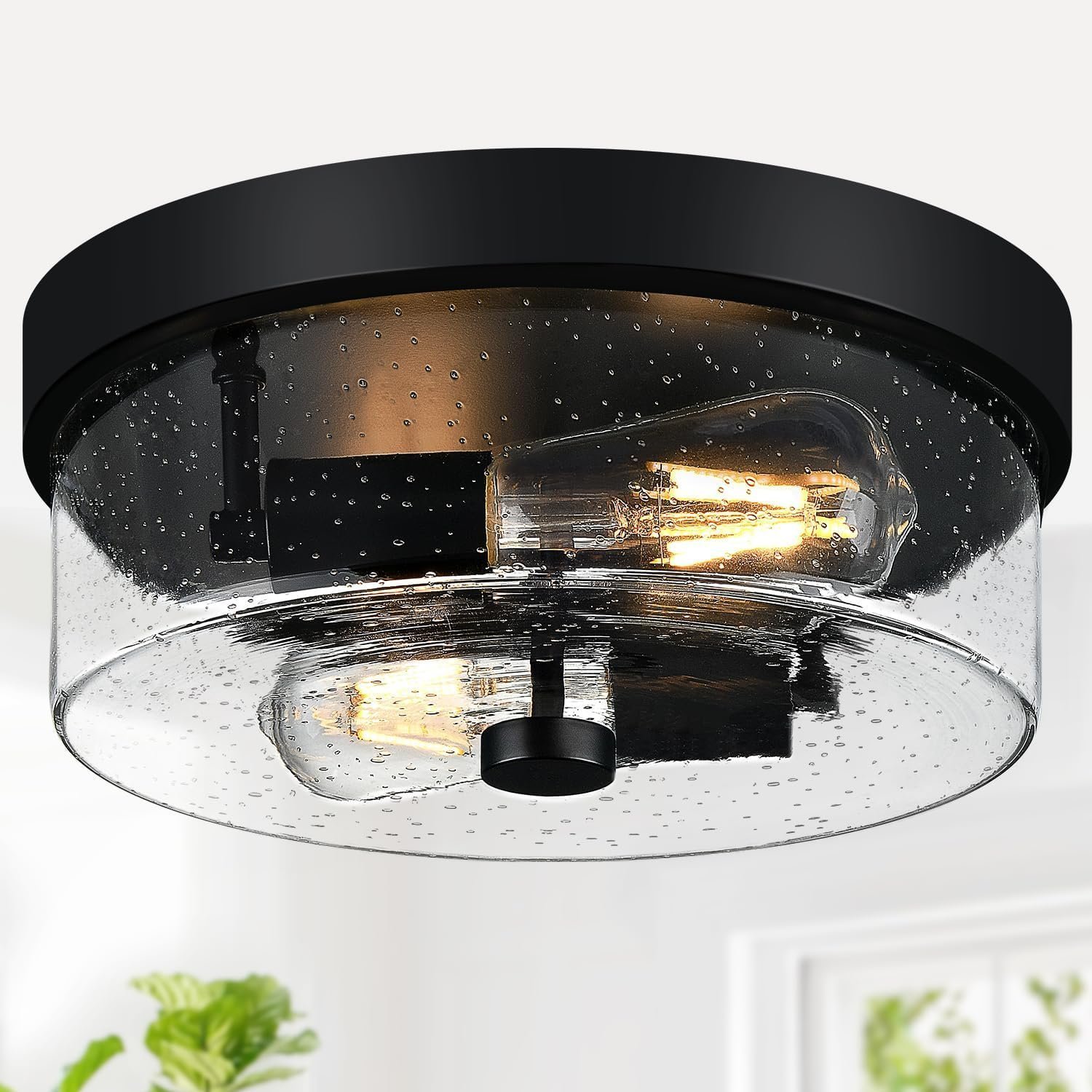 Infuse your hallway, kitchen, or entryway with rustic-industrial charm. This black flush mount fixture features textured seeded glass lampshades that diffuse light beautifully, creating a warm and welcoming atmosphere in any farmhouse or modern home.